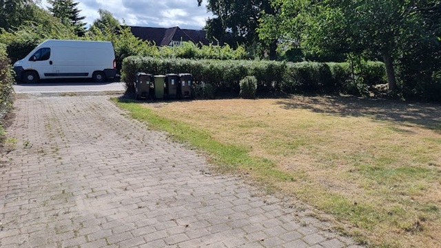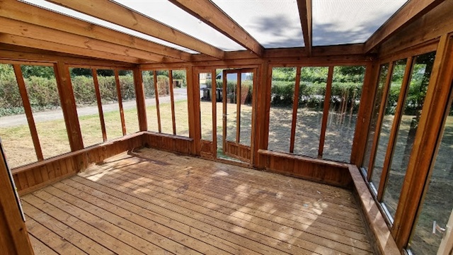Lovely garden with lawn, beds, large trees and several sun and rain gutters. Furthermore, smaller outbuilding and chicken coop at the back of the garden.