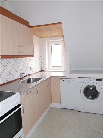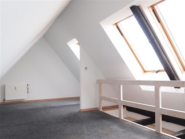 This recently renovated two-level penthouse apartment features an entrance hall leading to a kitchen fully equipped with all necessary appliances, including a fridge-freezer, stove, and dishwasher. The living space offers a bedroom with built-in wardrobes, a bathroom, and a living room that presents a view along with stairs ascending to an additional living area or room. The unit includes its own washer-dryer machine. Small pets may be allowed only with explicit written consent from the landlord. The apartment is available for immediate occupancy.