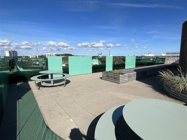 Residents have access to one of the city's most desirable rooftop terraces, providing panoramic views of Aalborg and its surroundings. The rooftop also offers a shared gas grill for communal use. Additionally, there is a convenient storage room available in the basement. This apartment truly warrants a personal visit.