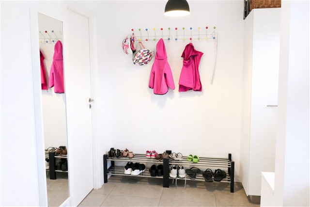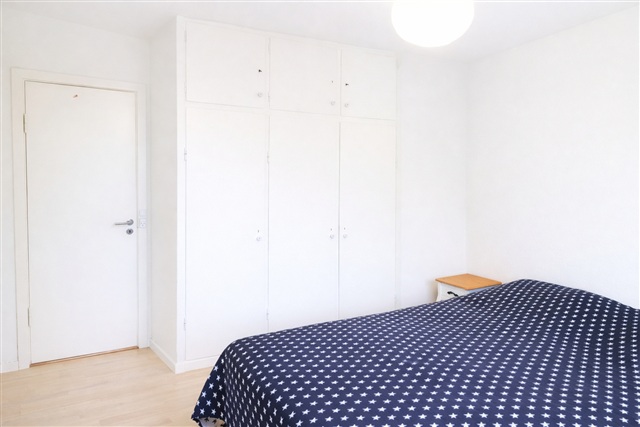 The house features a large kitchen with a generous dining area and underfloor heating, a hallway leading to two good-sized bedrooms—one with a large built-in wardrobe—a neat bathroom with tiled shower, laundry facilities, and underfloor heating. A spacious living room (where a smaller room can be re-established at the tenant’s expense) offers space for a dining table and a cosy seating area with sofas, etc. Plenty of windows facing the garden provide lots of natural light and a lovely view. Access to a wooden terrace and a sunny garden with a large shed (end-terrace house = walk-around access to the front garden).