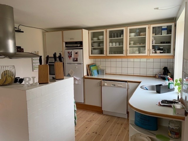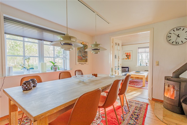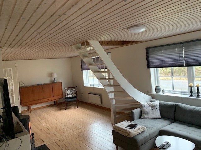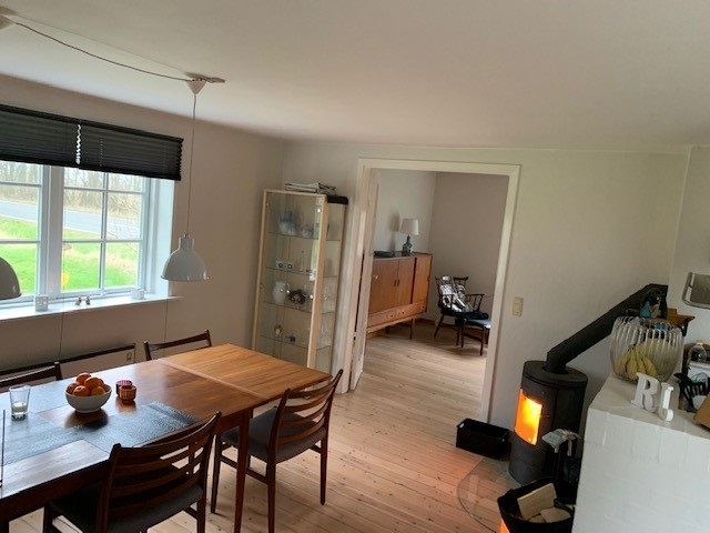 Kitchen/family room with white kitchen units, new ceiling etc. Nice living room with stairs to the 1st floor, two wood-burning stoves (one is brand new), Panasonic air to air heat pump (installed in 2023) large utility room with tiled floors and cupboards, large newer room, entrance hall with wooden floor with access to potato cellar and white guest toilet. The 1st floor contains a landing, large white toilet and bath with new doors/sanitary/countertop and brand new approved vinyl flooring, large bedroom with exposed beams and newer Velux skylights, room with loft and good light. The house has been modernized continuously from 2001 onwards, and has, among other things, received a new roof with extra insulation in 2006, a new approved trix sewage system (i.e. cheap water drainage fee), etc. The org. sanded and varnished pine floors (freshly sanded on the ground floor and stairs). The house appears well maintained and in good condition.