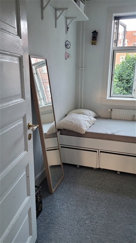 The room is equipped with a carpet and a bed with storage underneath, a closet, shelves on the wall, a mirror and a TV (you need your own streaming subscription).