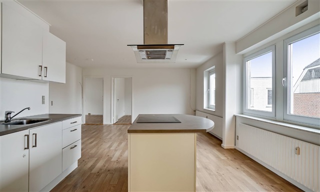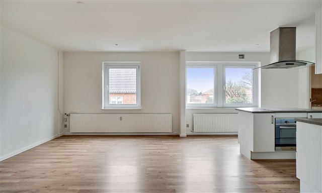This spacious and bright apartment is available for rent without any fixed lease period. The layout includes a modern kitchen, three well-sized bedrooms, a neat bathroom, and a living room. The entire unit has been recently renovated and appears in excellent condition. Viewings can be arranged through the office by contacting the current tenant.The property itself stands out prominently in the heart of Toftlund. It features a pleasant, private terrace accessible to all residents, providing a quiet outdoor space. The building is well-maintained and combines both commercial and residential units. Heating is supplied via district heating.