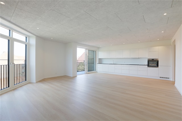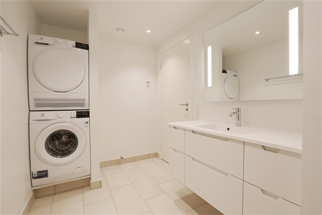 The apartment comprises one bedroom, which contains built-in wardrobes with sliding doors. Throughout the living areas, there is underfloor heating beneath durable, sound-absorbing vinyl plank flooring. Additional features include integrated LED spotlights mounted in the ceilings, floor-to-ceiling windows, acoustically treated ceilings, and a ventilation system serving the entire dwelling. Included with the apartment is an extra storage room located in the basement below the building, where parking facilities for both cars and bicycles are also available. The BBR-measured area of the apartment totals 97 square meters, while the net living area amounts to 85 square meters.
