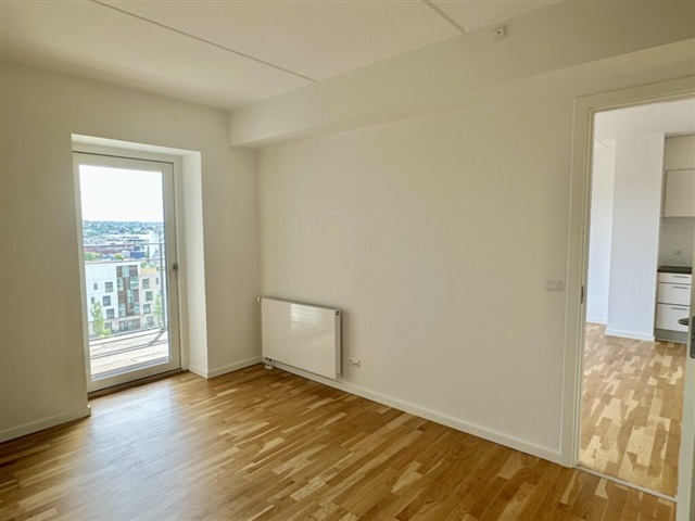 Situated within the newly developed Godsbane area, this bright apartment is housed in a modern building completed in 2016. The property features an entrance hallway with built-in wardrobes leading into a spacious, light-filled kitchen equipped with a full range of appliances. The kitchen flows openly into the living room, which provides access to a charming balcony that includes a storage room and offers a distinctive panoramic view over Aalborg and its surroundings. The bedroom is fitted with a substantial wall of closets and also grants direct access to the balcony. The bathroom is pleasantly bright with light tiles and underfloor heating, fitted with a combined washer and dryer as well as a stylish cabinet setup. White interiors with oak edging from Invita grace the kitchen, bathroom, and wardrobe units, complemented by naturally lacquered oak parquet flooring throughout the rooms.Just across the hallway, residents can access a shared rooftop terrace featuring beautiful vistas over much of Aalborg. The basement contains a secure storage locker. Covered parking for bicycles is available, alongside the option to rent a car parking space nearby. The local area also offers the right to use a playground and access to inviting green spaces, including a barbecue area equipped with tables and benches.