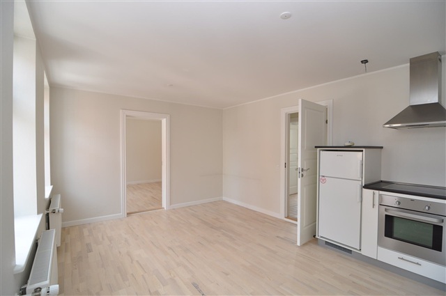 This beautifully renovated three-room apartment is located in the very center of Nykøbing Falster. The property features an entrance hall with an intercom system, a spacious living room combined with a stylish open kitchen, and two additional rooms, one of which grants access to a large private rooftop terrace. The modern tiled bathroom includes space for a washing machine.This rental opportunity, offered in excellent condition, is a rare find and should be viewed. The monthly advance payment covers both heating and water expenses.