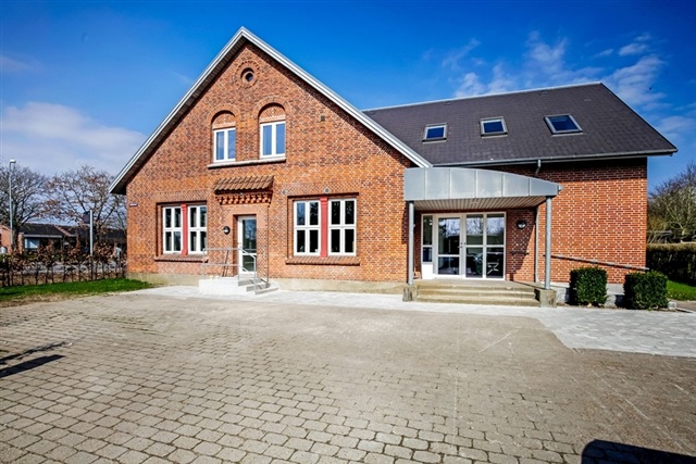 The building itself is the former Jelling Library, a striking and charming structure constructed in red brick. It has undergone extensive refurbishment that includes individualized ventilation systems with heat recovery to minimize heat loss, installation of new energy-saving doors, and triple-glazed windows.