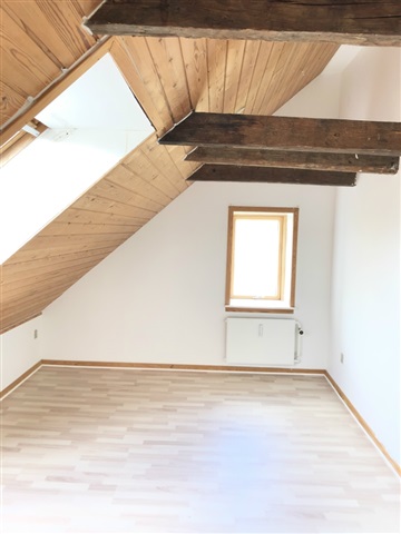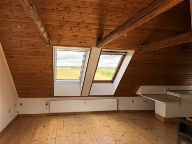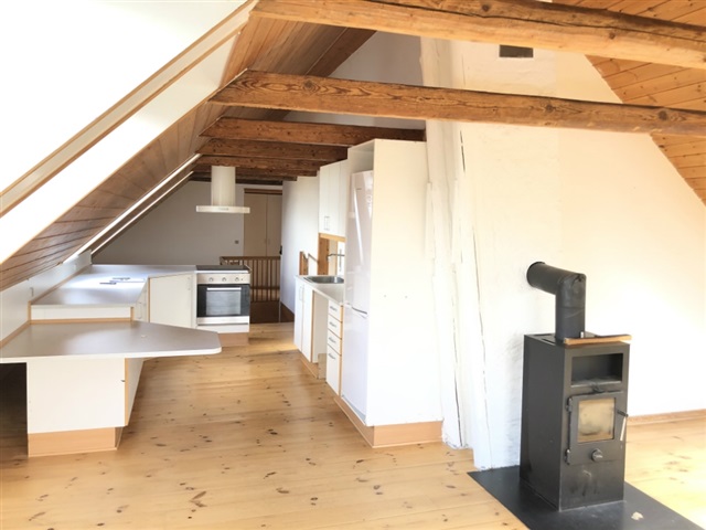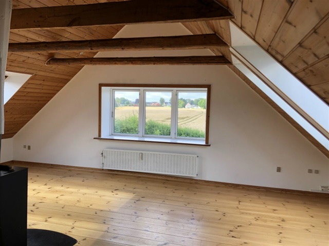 Nice and charming large apartment of approx. 115 sqm containing large entrance hall on the ground floor, living room with wood stove directly connected to newer open kitchen, 3 nice bedrooms and nice bathroom. There is the possibility of creating an additional smaller room. All rooms are in pitch with free tap bands/rafters. Small laundry niche with possibility of connecting a washing machine and dryer. Wooden floors. Private garden which is looked after by the tenant. Parking space behind the property.