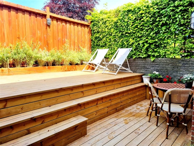 •"cozy" garden, covered terrace with dining furniture, green plants, sun-chairs.