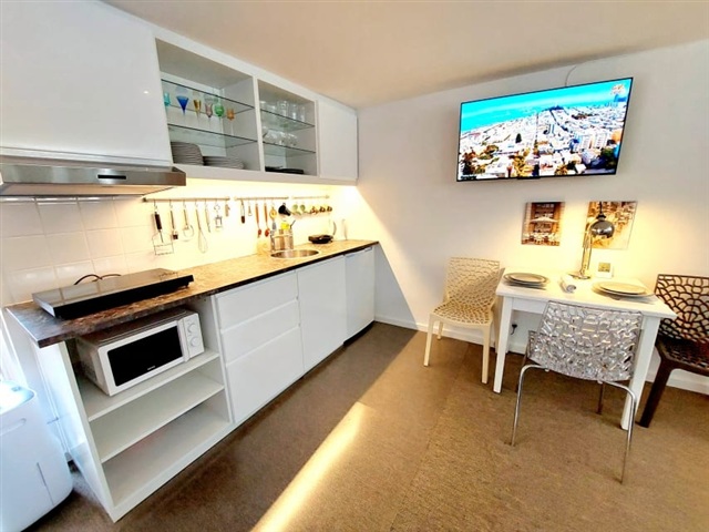 •fully equipped large kitchen with dishwasher, stove, oven, toaster, sandwich maker, microwave, refrigerator, plates, pans, pots, etc.