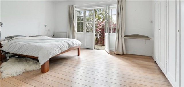 Inside, the home presents itself as highly elegant, with high ceilings in the living areas, exquisite parquet floors, and a fireplace adding to the ambiance. Located close to Jægerborg Allé, the house benefits from a variety of shops nearby. Public transportation, schools, and kindergartens are all within easy reach.
