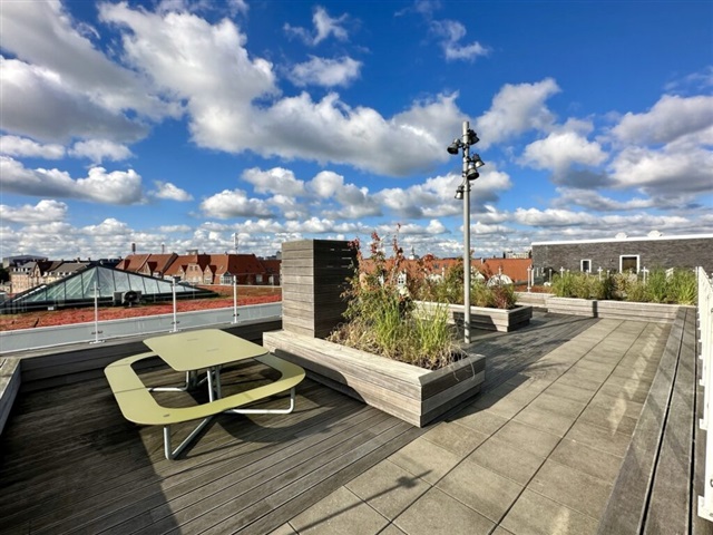 Residents benefit from a beautiful covered atrium courtyard that provides a cozy communal space. Below ground, spanning two levels, there is an option to rent a parking space accessible via car elevator. Furthermore, a delightful shared rooftop terrace offers panoramic views of Aalborg and its surroundings.