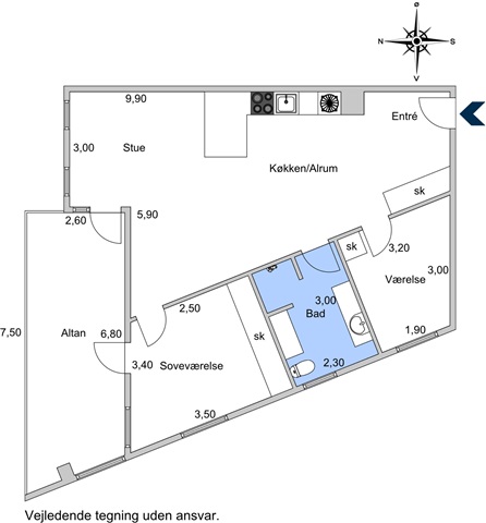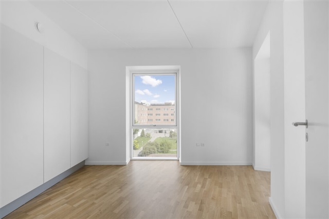 This home comprises a light-filled master bedroom and an additional room, both equipped with built-in wardrobes. Access to a large balcony overlooking Jyllandsgade is available from both the living room and the master bedroom, offering a lovely view.