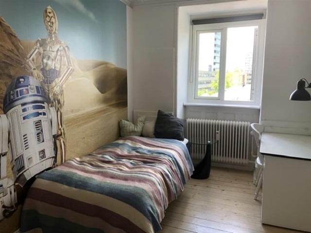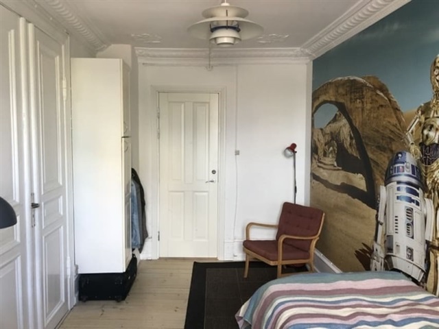 A furnished room of approximately 12 square meters is available, offering an exceptional view overlooking both Frederiksberg and Vesterbro. This room features a 90x200 cm bed, a practical wardrobe, a desk for work, an armchair, lighting fixtures, a chest of drawers, as well as a TV equipped with Chromecast. The space benefits from a high-quality triple-glazed window and has a door opening directly into the hallway. Convenient access is provided to a modern bathroom complete with a washing machine and dryer, as well as a large kitchen area suitable for dining and social gatherings.The accommodation is situated on the fourth floor of a historic penthouse apartment in Vesterbro, located in close proximity to both Frederiksberg Allé Metro and Enghave Metro stations. The landlord has two sons aged 13 and 17, who reside in the apartment part-time, approximately four days every two weeks.