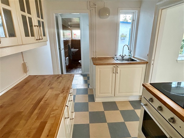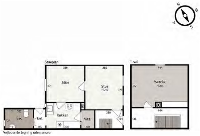 The house consists of two small living rooms, a kitchen and a room with sloping walls on the first floor, with stairs up from the entrance. There is a toilet/bathroom with shower.
