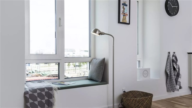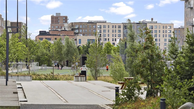 The Fælledudsigten building was completed in 2017 within the Arenakvarteret area of Ørestad. Its design is notable for offering views facing all four cardinal directions from balconies that are sheltered and roofed. Constructed primarily from brick, the building's facade features a variation of colors and staggered elements. The distinctive covered balconies contribute to a dynamic facade and provide protection from the elements, allowing residents to extend the outdoor season on their balconies. The structure uses durable materials that require minimal maintenance, and every apartment meets the A2010 energy rating standard. Additional conveniences include a storage unit located in the basement, and for those wishing to host special occasions, a communal event room is available to rent in the neighboring building, Fælledudsigten I.