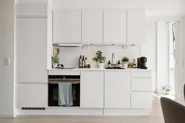 Inside the apartment, the living room and kitchen form an open-plan layout, providing ample space for both dining and sitting areas. The kitchen is fitted with white cabinetry, a white countertop, and integrated appliances including a fridge/freezer, oven, extractor hood, and dishwasher. Access to the balcony is through the living area.