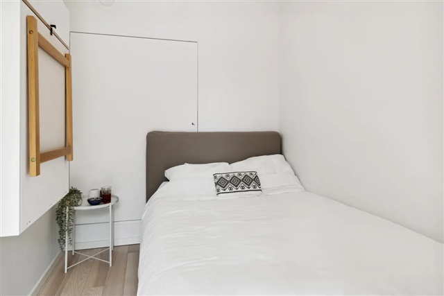 The apartment also includes a well-sized bedroom featuring a built-in wardrobe, as well as a bathroom equipped with a separate shower enclosure with frosted glass, white cabinetry with matching countertop, and a stacked washer and dryer unit.