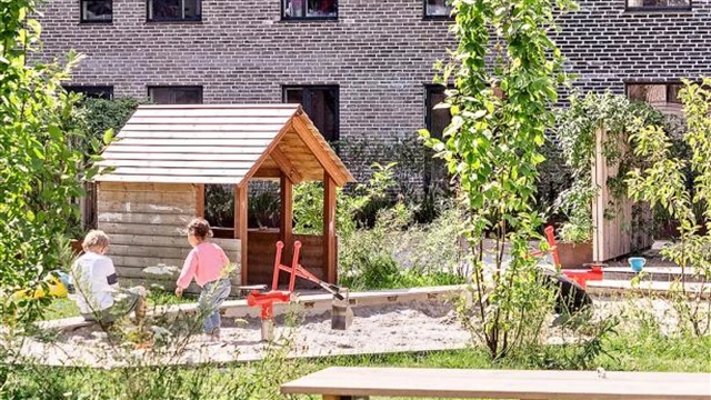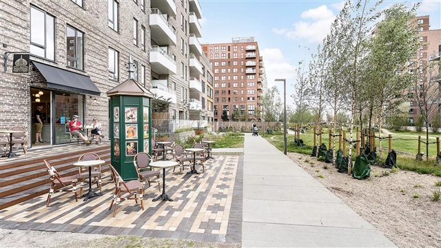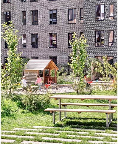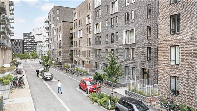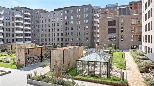 The building known as Bastionen is characterized by its strong architectural identity, created by the award-winning firm Danielsen Architecture. Upon arrival, you are greeted by the distinctive Winter Gardens that decorate the building's façade and guide you toward the lush courtyard. Plant species native to the nearby Kalvebod Fælled have been incorporated into both the courtyard and the balconies, helping to shelter the space from wind while establishing a verdant oasis. The southwestern section of Bastionen has been purposefully constructed at a lower height than the rest of the building to maximize sunlight in the courtyard and to optimize views of the surrounding forest area known as Skovrummet and the meadowlands of Fælleden. This lowered corner also brings abundant daylight into the apartments located there. The courtyard's diverse and vibrant vegetation provides tranquil seating areas as well as ideal natural play zones featuring tall climbing trees, gentle hills, and meadow grasses perfect for hide-and-seek. Additionally, the courtyard includes a greenhouse, a basketball court, and a covered bicycle parking area. The property is equipped with an elevator, an intercom system with video capabilities, and offers the option to rent an underground parking space.