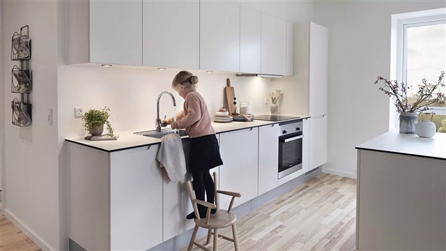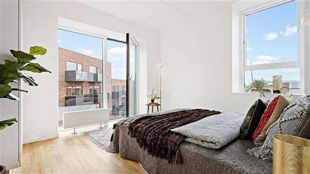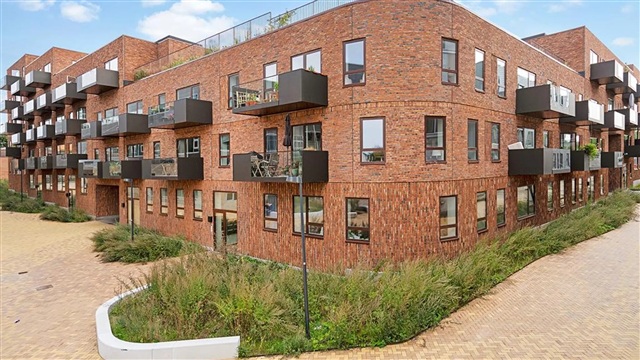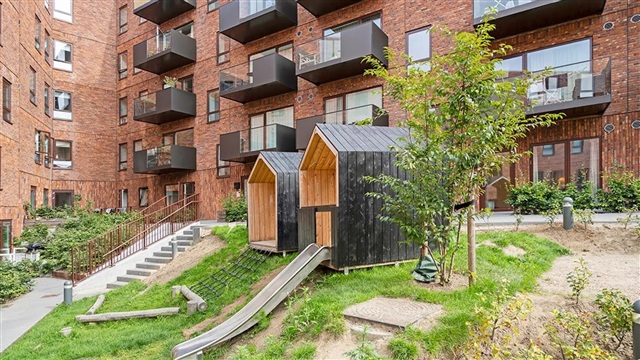 The building known as Carlsbakken was designed by the award-winning architectural firm Holscher Nordberg, resulting in a contemporary structure distinguished by three rounded corners and varying heights. These soft, curved edges impart a unique, organic character to the property. The differing elevations not only contribute to dynamic façades but also maximize natural light in the apartments and courtyard spaces, in addition to providing a sun-exposed communal rooftop terrace. The use of red brick connects to Hillerød's historical architecture and iconic buildings. Carlsbakken is also an energy-efficient, low-energy construction that minimizes environmental impact. The roof is covered with sedum plants, which are both aesthetically pleasing and serve to absorb and delay large quantities of rainwater. The name "Carlsbakken" derives from the sloping terrain around the building, which creates an engaging and varied courtyard area, naturally segmented to accommodate recreational activities and social spaces. Moreover, ground-level bicycle parking is available within the property, accessible without stairs, allowing residents to securely store bicycles or cargo bikes protected from the weather.