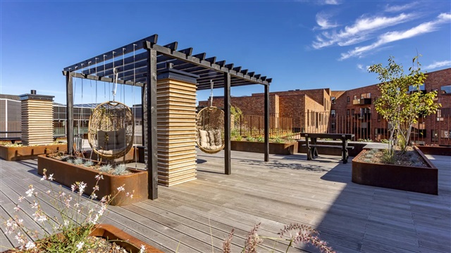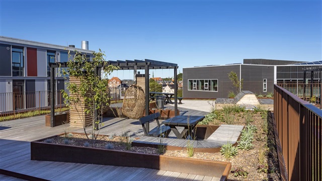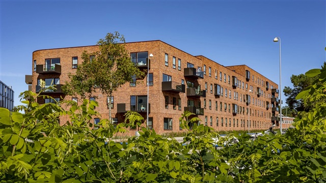 The building itself, known as Carlsbakken, was designed by the award-winning architectural firm Holscher Nordberg. It features a modern structure characterized by three rounded corners and varying heights, giving it an organic and distinct appearance. The variation in height creates dynamic facades and maximizes natural light in both the apartments and courtyard areas, including a communal rooftop terrace designed to receive plenty of sunlight. The exterior is clad in red brick, echoing the historical architecture of Hillerød and its iconic buildings. Carlsbakken is constructed as a low-energy building, aimed at minimizing environmental impact. Its roof is covered with sedum plants, which not only provide aesthetic appeal but also function to absorb and delay rainfall runoff. The property's name derives from the sloped terrain, which forms an engaging and diverse courtyard space, naturally divided into zones suitable for both play and relaxation. Moreover, bicycle parking is conveniently located at ground level without any stairs, offering secure, covered storage for bikes and cargo bikes.