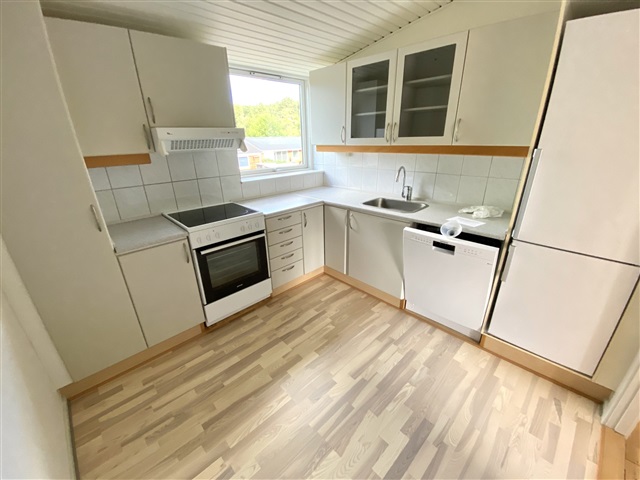 This bright three-room apartment of 77 m² is available for rent on the first floor, situated close to Munkebo Bycenter and the fjord. Upon entering, you find a spacious hallway providing access to all rooms, featuring built-in closets for ample storage.The kitchen is well-appointed with appliances, including a dishwasher, and offers a comfortable dining area. The bathroom is well-maintained and equipped with a shower. The accommodation includes a large, light-filled living room, a generously sized master bedroom, and a suitable children's room.