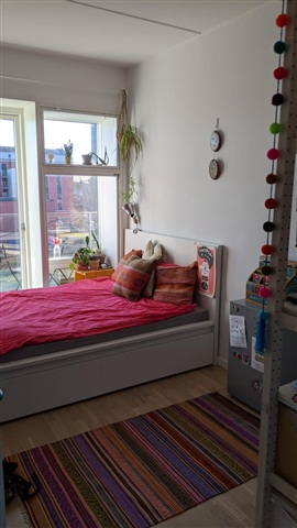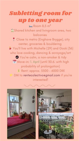 A room is available for sublet in a pleasant shared apartment located in Sydhavnen, a calm neighborhood near the water, supermarkets, and a bouldering gym. The area benefits from its proximity to Enghave Brygge Metro station, making commuting convenient. The apartment features a large communal living room and a sunny balcony, offering comfortable shared spaces.The room itself measures approximately 8.5 square meters, receiving ample natural light and providing sufficient room for essential furniture. You would be sharing the apartment with two housemates: Gook, aged 36, and Michelle, 29. They appreciate living in a home that balances communal interaction with personal privacy. Their interests include acroyoga, design, dancing, and cooking, and they enjoy coming together occasionally over coffee, tea, cocoa, beer, a good meal, or even a spontaneous dance in the living room.
