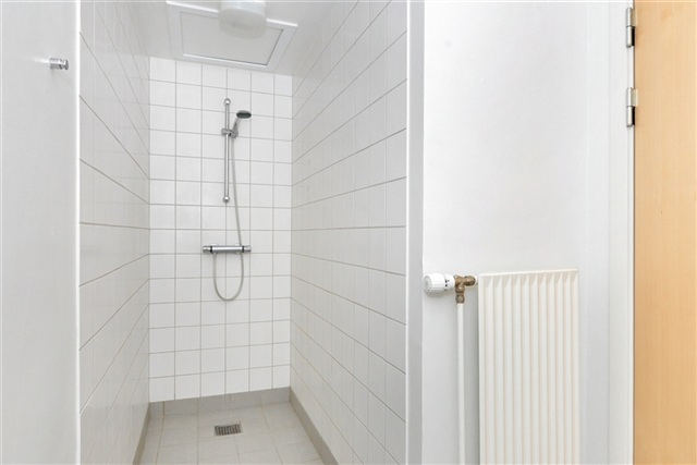 Erik Grøn Kollegiet offers a collection of 90 modern student apartments situated centrally in Haderslev, designed with either one or two rooms to create bright and welcoming living spaces. Each unit features a kitchen area, which may be either separate or integrated into the entryway that includes spacious built-in wardrobes. The kitchen is equipped with essential appliances such as a refrigerator, range hood, stove or alternatively an oven with separate hotplates. The combined living and sleeping area is illuminated by natural light and finished with beech parquet flooring. Bathrooms contain neat gray tiled floors paired with white walls made of either glass fabric or tiles, and are furnished with a shower and toilet. Outside each apartment, residents have the opportunity to arrange a small outdoor seating area with café tables, chairs, and planters.Regarding expenses, water and heating charges are billed monthly by the landlord as an advance payment, while electricity is to be settled directly with the utility provider.