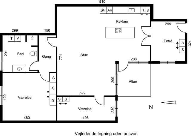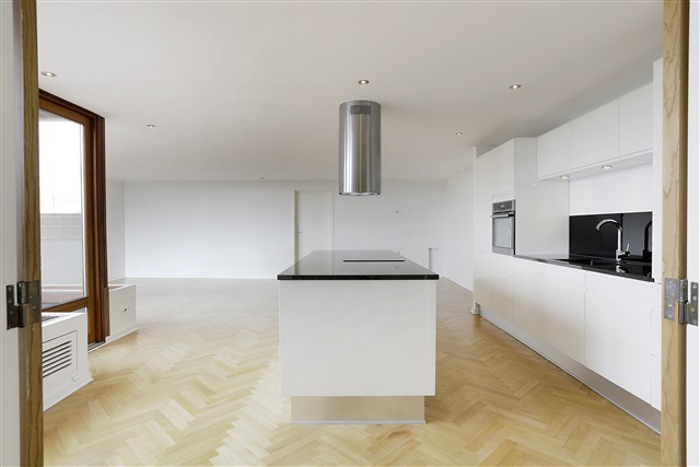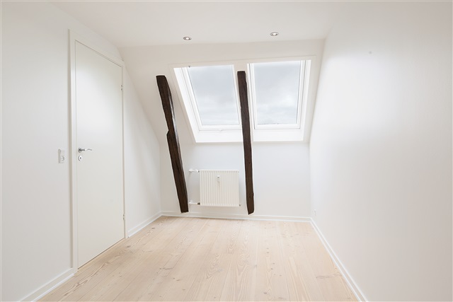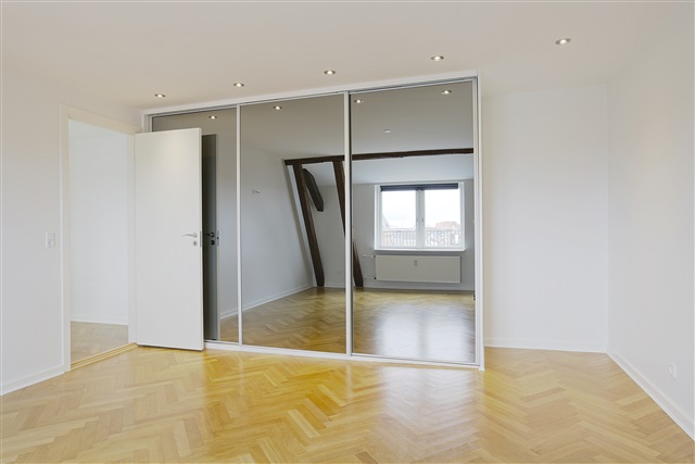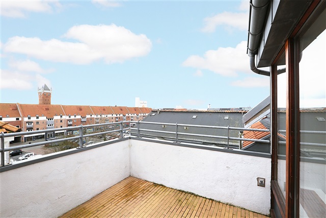 Constructed in 2013, this distinctive and modern grand apartment is situated on the fourth floor of a prominent corner building, which is also home to Matas on Torvet. Access to the residence is gained from Torvegade through a bright, wide staircase featuring tiled steps. Upon entering the flat, one is greeted by a luminous foyer adorned with white-painted walls, expansive built-in wardrobes fitted with sliding doors and mirrors, complemented by recessed LED lighting. Attention to detail is evident throughout, notably with elegant herringbone parquet flooring extending across all living areas.From the hallway, a double-glass door leads into the spacious and luminous kitchen-living area, where a white high-gloss Designa kitchen seamlessly integrates with a large combined dining and lounge space. The kitchen is equipped with solid black granite countertops and offers ample cabinet storage. The living room provides access to a private terrace oriented to the west, offering views over the rooftops of the city as well as glimpses of the harbor and Fanø Island.