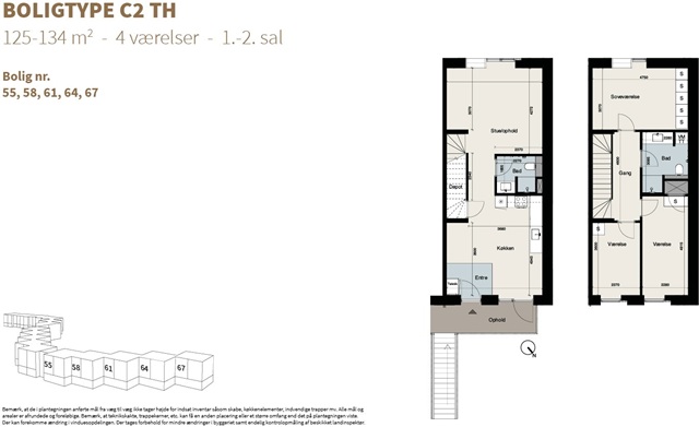 The C2 housing type is designed to accommodate a variety of family sizes, offering ample space on both the ground and upper floors. The open-plan living area is bright and welcoming, featuring a stylish HTH kitchen fitted with Siemens appliances.On the ground level, there is a guest bathroom, while the first floor contains three bedrooms along with an additional bathroom. The home benefits from large windows that flood the interior with natural light, underfloor heating, and built-in closets.