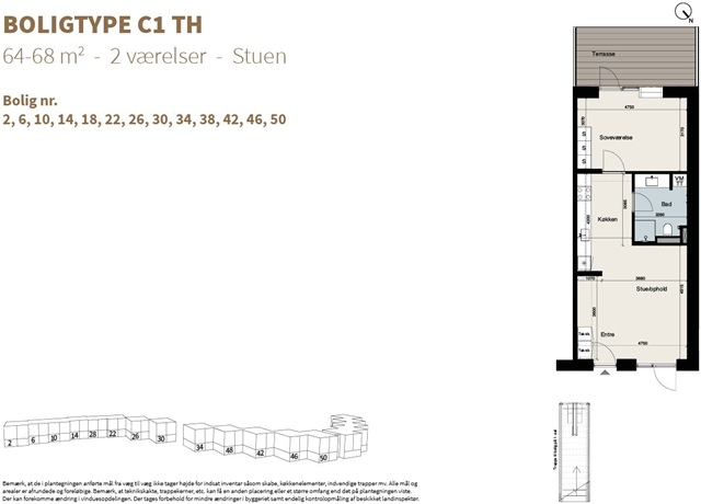 The C1 two-room apartments are designed to suit singles, couples, and seniors. These residences are all located on the ground floor and feature a single-level layout, each offering spacious terraces facing west.Natural light fills the homes thanks to large window sections, complemented by underfloor heating and built-in wardrobes. Additionally, there is access to a private terrace oriented southwest.