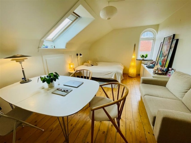 A bright and inviting room within a private attic apartment is available for rent for a period of up to one year or longer, with the option to extend. Situated on Sankt Laurentiivej in Roskilde, the accommodation benefits from proximity to a park, the harbor, and the city center. It is also within walking distance of Roskilde station, providing convenient and quick connections to Copenhagen, Roskilde University (RUC), and Risø. The tenant will have shared access to the kitchen, bathroom, and washing machine, alongside bicycle parking facilities located in the courtyard. The room comes fully furnished.The space is intended primarily for a quiet, non-smoking tenant, which may be a student, an individual, a couple, or someone older.