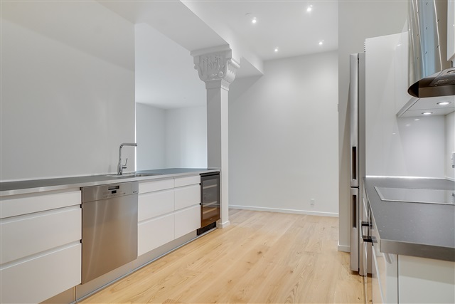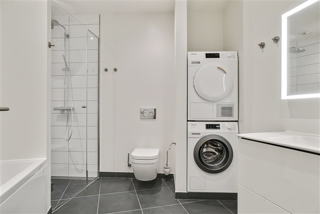 Situated in the very center of Odense and directly adjacent to Gråbrødre Plads, this newly constructed two-room apartment spanning 106 m² is available for rent. The residence is positioned on the first floor.Upon entering, one is greeted by a spacious hallway featuring built-in wardrobes and ceiling spotlights. This area grants access to a generously sized bathroom equipped with a bathtub, washing machine, dryer, and other fittings, all sourced from Duravit.