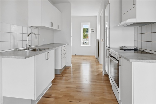 Located at the intersection of Vedelsgade and Tønnesgade, in one of Vejle's most central and sought-after areas, this property combines historic charm with modern updates. The building at Vedelsgade 34 is a traditional red-brick structure spanning three floors, featuring a tiled roof and white-framed windows dating back to 1926. After renovations completed in 2004, the apartments were elevated to contemporary standards. Adjacent to this, the buildings on Tønnesgade are three-story constructions from 2004, characterized by alternating red and yellow facades and complemented by gray window sections. Residents' vehicles are registered via their license plates upon move-in, enabling easy parking access, and tenants also receive two guest parking permits. The community benefits from a cozy shared outdoor area equipped with a bike and moped shelter, seating with picnic tables, a barbecue area, and space designated for ball games.The apartments in Tønnesgade are designed with practicality and comfort in mind, featuring threshold-free flooring throughout with beech parquet in most areas. Kitchens are outfitted with white melamine cabinets, and some units have vinyl flooring. Standard kitchen appliances include a fridge-freezer, stove, and extractor hood with a ventilation system. The kitchens open directly into the living rooms, and 14 of the two-room apartments additionally offer balconies accessible from the living area. Bedrooms come with built-in wardrobes, and tenants are allowed, subject to approval, to install a dishwasher, washing machine, and condenser dryer, with installation costs borne by the occupant. Bathrooms are fitted with vinyl floors and light-colored tiles in the shower section. All floors except the ground level feature a corridor with space for pots and a small café table at one end.