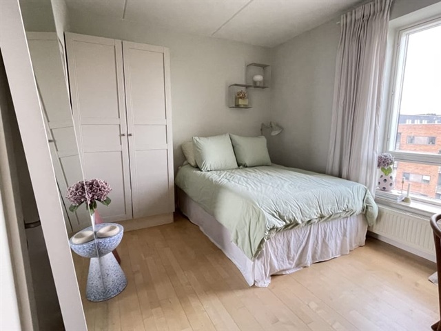 The room available spans 16 square meters, filled with natural morning light that creates a welcoming ambiance. It comes furnished with essentials including a bed, wardrobe, mirror, and a workspace, making it move-in ready if desired. Shared areas available to use include the combined kitchen and dining space, a spacious bathroom equipped with both washing machine and dryer, and a sunny balcony featuring a grill alongside scenic views over Amager Fælled. Additional storage can be found in a separate room within the apartment.
