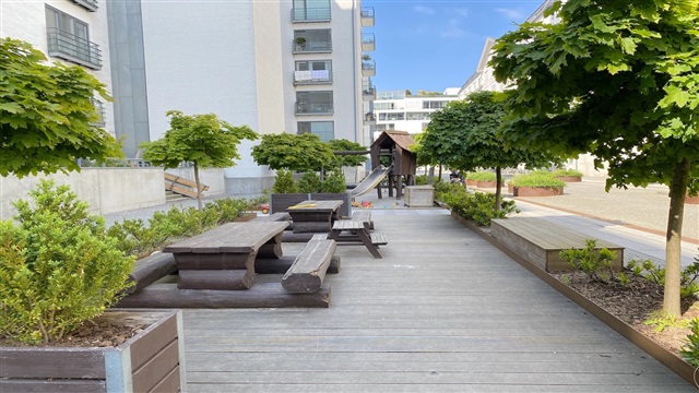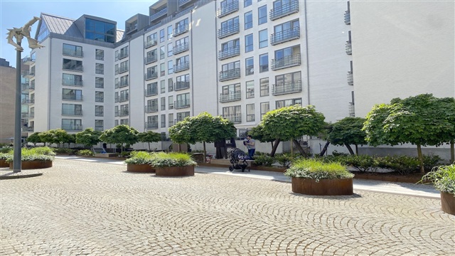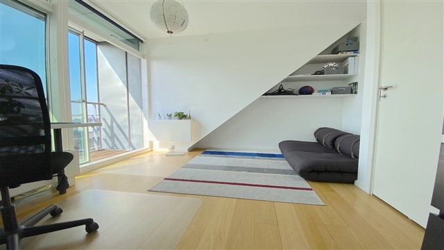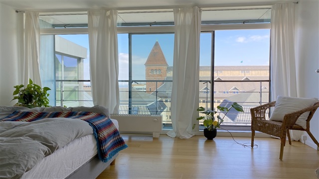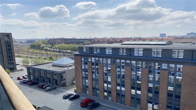 Situated on the seventh and top floor of an attractive building at Amerika Plads, this residence benefits from elevator access. Upon entering the lower level of the apartment, one finds an entrance area equipped with built-in closets, alongside a spacious and well-maintained bathroom featuring a shower and a combined washer and dryer unit. The kitchen, seamlessly integrated with the dining area, opens onto a charming balcony that offers lovely views. The living room is characterized by abundant natural light and provides access to another generously sized balcony.The upper level houses the master bedroom, which includes a walk-in closet and a door leading out to a smaller balcony. Additionally, there is a second bathroom on this floor, complete with a large corner bathtub. A further bedroom also offers access to a separate small balcony. In the building's basement, a storage room is available, and residents can rent a private parking space. The property includes a cozy communal courtyard area. Conveniently located, the apartment is within walking distance of both Østerport and Nordhavn stations, has excellent shopping options nearby, and is close to the Copenhagen International School (CIS).