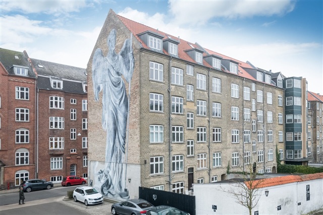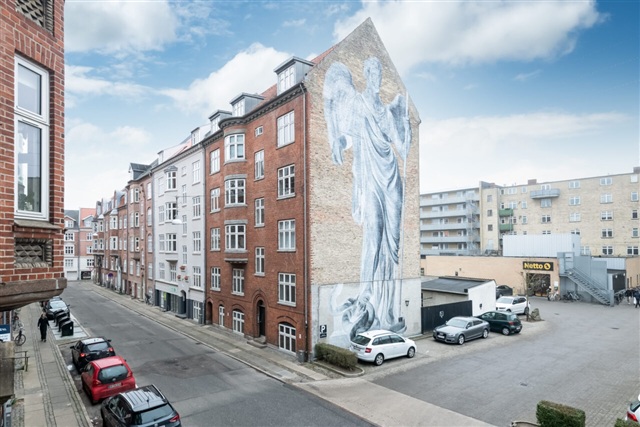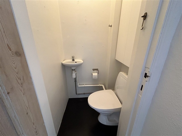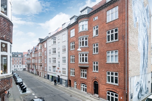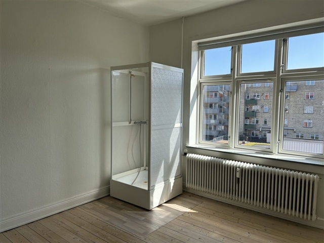 This apartment is situated on Holbergsgade in the heart of Aalborg. Its central position offers immediate access to pedestrian streets, a variety of shopping options including a Netto supermarket located directly opposite the building, as well as proximity to Aalborg's waterfront, the Salling shopping center, numerous restaurants, cafés, and all the amenities that the city center provides.Inside, the flat features a spacious entrance hall with designated space for footwear and outerwear. From here, you enter a large living room adorned with an elegant ceiling finished with stucco moldings. The bedroom includes a fitted shower cubicle. The kitchen is equipped in white tones and contains a stove, a refrigerator/freezer unit, an extractor hood, and overhead cabinets for storage. Additionally, there is a smaller bathroom with tiled flooring.