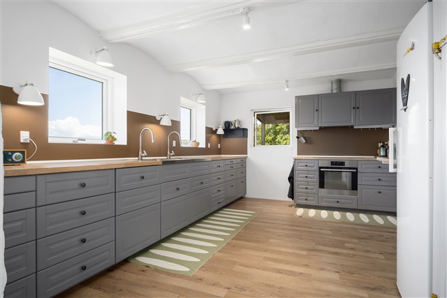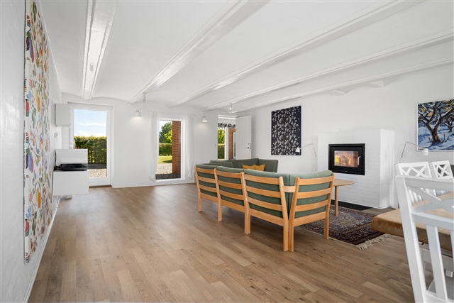 Renovated house of 91 sqm with open kitchen/family room, dining area and living room. Lovely bedroom and bathroom. Practical utility room with washing machine and pantry and plenty of cupboard space.Underfloor heating throughout and cozy fireplace area in living room. The home has its own west-facing garden with herb beds, lawn and covered terrace with a view over the fields.
