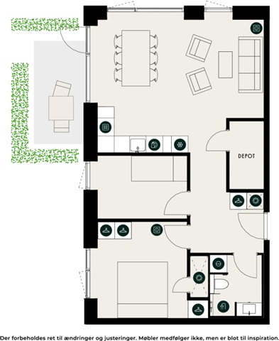 This corner apartment offers a well-organized layout featuring three rooms. Upon entering, a hallway provides access to all rooms within the unit. The living room is spacious and opens directly onto a west-facing terrace that enjoys plenty of sunlight. Adjacent to the living area is a contemporary white Invita kitchen equipped with energy-efficient Siemens appliances, including an induction cooktop. The bedroom contains built-in wardrobes, while the additional room offers ample space for various needs. The bathroom is designed with neutral-toned tiles and cabinetry and includes underfloor heating. It is fitted with a sculpted sink paired with an Adora mixer tap, a Villeroy & Boch toilet, and a combined washer-dryer unit. Throughout the apartment, you will find attractive matte-finished Nature Oak lamella parquet flooring, and the large impressive windows ensure abundant natural light in every room.Pet permission can be requested for all of our rentals. Those moving into this lovely apartment will benefit from a natural setting right outside the door and have access to the vibrant cultural offerings in Helsingør. Please note that if detailed measurements of the apartment are needed, visitors must bring their own measuring tools as the floor plan does not include exact dimensions.