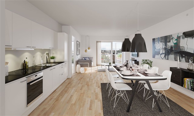A quality home which is perfect for those who want to live close by the city while having access to nature and a safe environment.The apartments are designed in a timeless Nordic style with plenty of light from the large windows in the living room, beautiful wooden floors and a general focus on simplicity.The area invites to being together in the unique urban gardens elevated a floor above ground level and connected by bridges between the four plinths. Parking is cleverly placed under the gardens.Pets are allowed.OBS: Floor plans can deviate as they are only guiding