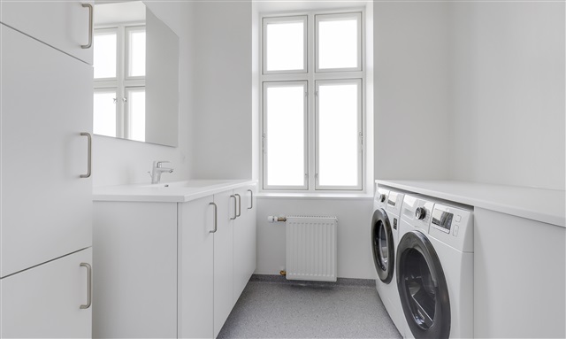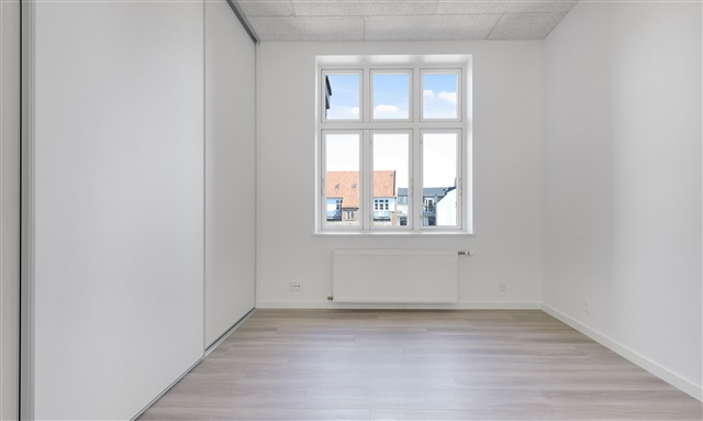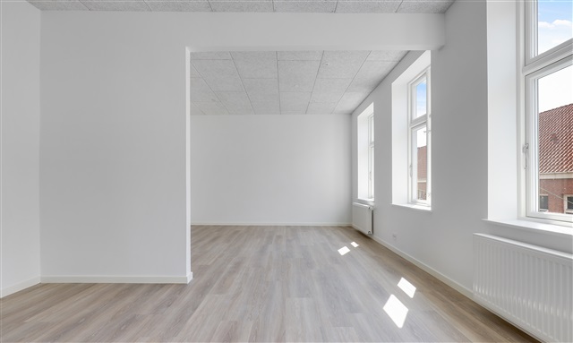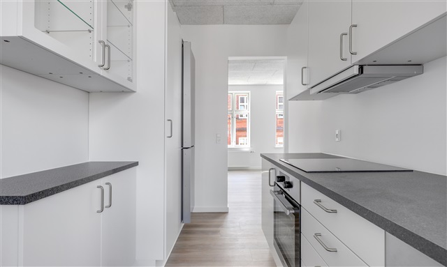 Recently renovated apartment located on Skolegade features a well-designed entrance area that includes space for wardrobe storage. The kitchen is brand new and equipped with a full range of modern appliances, as shown in the accompanying photos. The spacious living room offers flexibility in furnishing and is complemented by bright flooring throughout.The large, elegant bathroom comes with a shower and a washing column, providing ample storage solutions. The main bedroom, facing the courtyard, includes a wall of built-in closets. Additionally, there is a second room that can serve as an office or extra bedroom, also fitted with storage cupboards. The apartment offers numerous storage options overall.