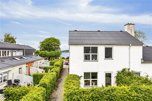 Bright, newer duplex house in scenic surroundings on the south side of Kolding Fjord. The townhouse is fully furnished, including four sleeping places (double bed and two single beds).On the ground floor there is a hallway, bathroom, available room and kitchen-dining room with access to a terrace. On the first floor there is another room and a large, bright living room with a pitched ceiling.