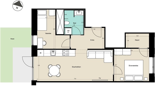 This beautiful, bright apartment in the area invites you to both coziness and togetherness. The home has beautiful parquet floors with underfloor heating in all rooms. The kitchen is a simple and modern white Svane Deco kitchen with quality white goods including a dishwasher from Electrolux. In the bathroom you will find a washer/dryer. The storage room is designed into the square meters of the homes, either in the form of a cupboard or a smaller room that you can transform into your own walk-in closet. Beautiful outdoor spaces All homes have their own balcony or terrace that faces the green heart of the building: the courtyard, where you can create a beautiful outdoor space in the home with cozy furniture, cushions and pots. As well as enjoy the evening sun or a good meal. In the green common room you can feel the cozy atmosphere of the surrounding allotments with everything from bird boxes, insect hotels to rainwater barrels and fruit trees. Let the kids loose on the playground or enjoy a glass of wine over a game of petanque with the neighbors. Use the greenhouse in the courtyard and on the shared roof terrace to extend the summer and watch the seasons change. Here you can use your green fingers to get tomatoes, herbs and vegetables to sprout. Everything has been thought of here. A free parking license is included per home. TDC provides antenna and fiber, which you can connect to or freely choose another provider. As a resident, you also have access to a common room with a kitchen and the common roof terraces. Pets are welcome. It is possible to get permission for one pet up to 25 kg. NOTE: Floor plans are indicative and reservations are made for any discrepancies. The pictures are from our two sample homes and may therefore differ from the specific home.If you want to read the description in its original language that is also possible. Read original description