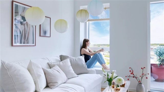 The building itself was designed by the award-winning architects Mangor & Nagel and features numerous architectural details. Variations in the color of the mortar, balconies set slightly back, and occasional round windows contribute both vibrancy and balance to the façade. The distinctive color contrasts between the yellow-brown bricks and the red balconies and window frames make the structure stand out within its surroundings. A major highlight of Rubinhaven is its 214-square-meter flexible communal area located on the ground floor. Designed to foster creativity and neighborly engagement, this space acts as an extension of the individual apartments. Residents can enjoy combined comfort and utility, whether for studying, remote work, reading the newspaper, or casual conversations with neighbors, all while savoring freshly brewed barista coffee. There is a play corner ideal for mothers' groups, and the stylish private dining room accommodates gatherings or birthday celebrations with seating for ten guests.