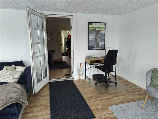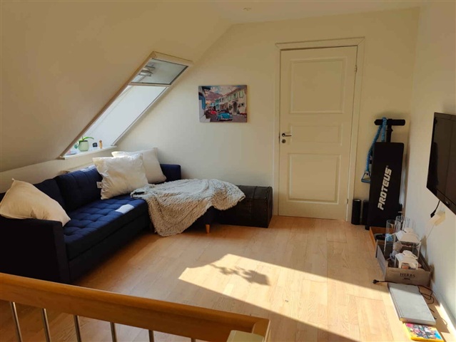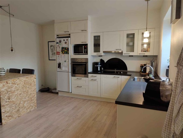 Apartment of 102 m2 on 2 levels. Large kitchen-dining room with access to 30m2 beautiful garden room, large garden, large bathroom, hallway with stairs to 1st floor. 1st floor 2 rooms, one with walk-in closet, small living room above the stairs. Cheap heating and water 1200 kr. per month. Electricity is settled 2 times a year according to the meter.If you want to read the description in its original language that is also possible. Read original description