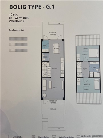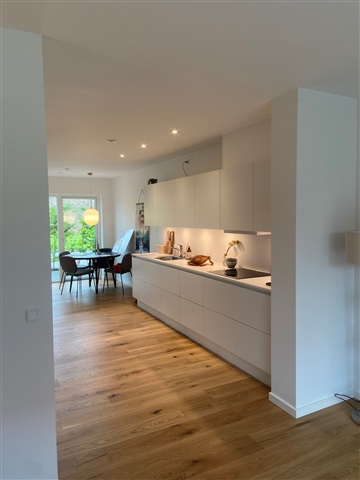 Situated on Åsvej, these charming terraced houses offer the advantage of unlimited lease terms and are designed to maximize natural light throughout the interiors. The residences feature elegant oak flooring, sophisticated Designer kitchens, and well-appointed bathrooms, complemented by ample furnishings and built-in storage solutions. Each unit includes its own climate control system and underfloor heating installed throughout the living space. Moreover, tenants benefit from a private terrace and an individual basement storage room. Parking options are conveniently available nearby. The homes are positioned close to expansive green areas accessible to all residents, enhancing the outdoor experience. Pet ownership is permitted with a special allowance for either one dog or one cat.The specific layout of this dwelling comprises an entrance hall, a guest toilet, and an open-plan kitchen and dining area seamlessly connected with the living room. Upstairs, a staircase leads to the first floor, which houses two spacious bedrooms along with a bathroom.