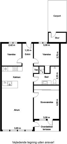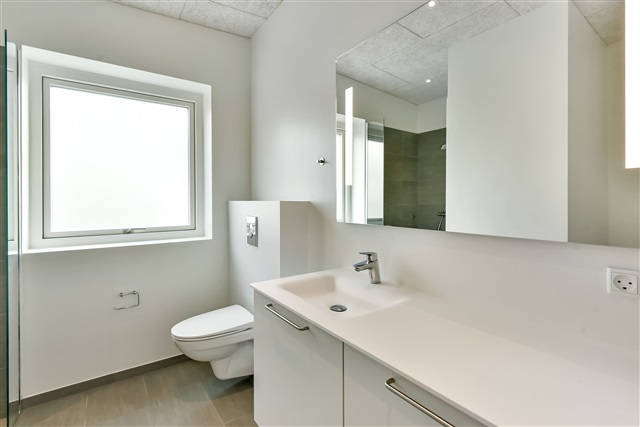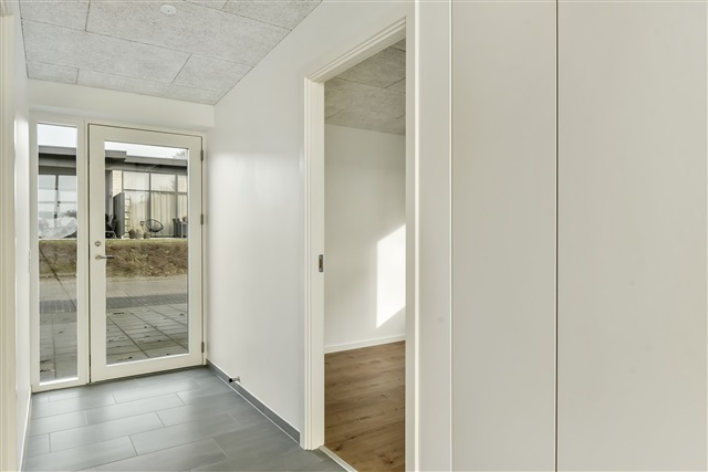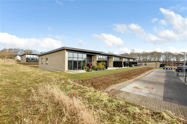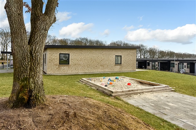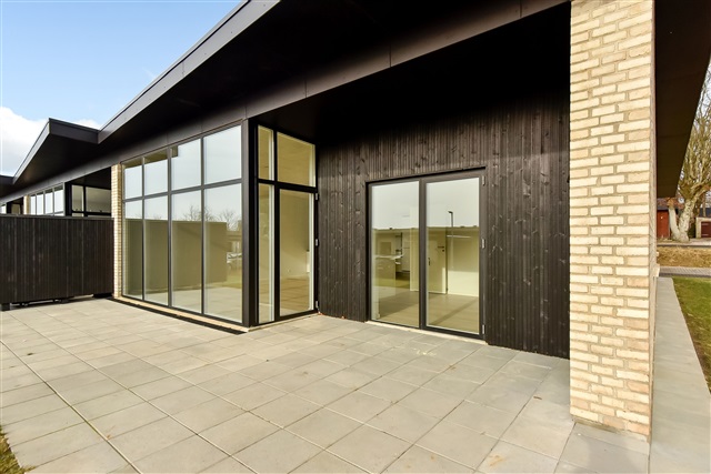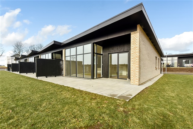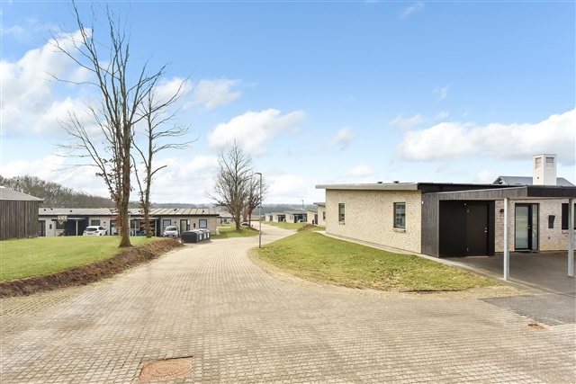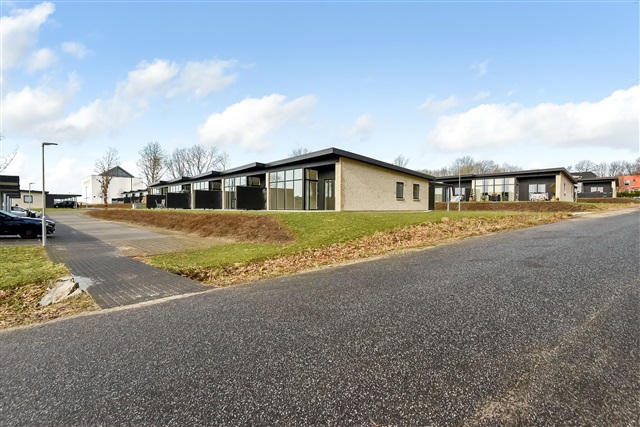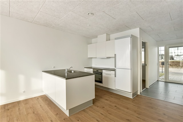 A newly constructed end townhouse is available for rent in a recently developed neighborhood near Herning. The layout features an open-concept kitchen and living area, a bedroom equipped with built-in wardrobes, two additional rooms, and a bathroom spacious enough to accommodate a washing machine and dryer stacked vertically.From the living space, there is direct access to a terrace, along with a private carport and an outdoor shed. One pet, either a dog or a cat, is permitted in the residence, while smoking inside the property is prohibited.