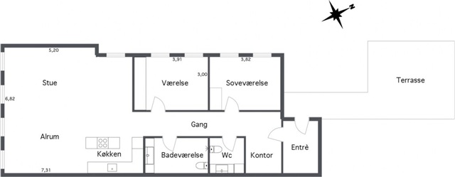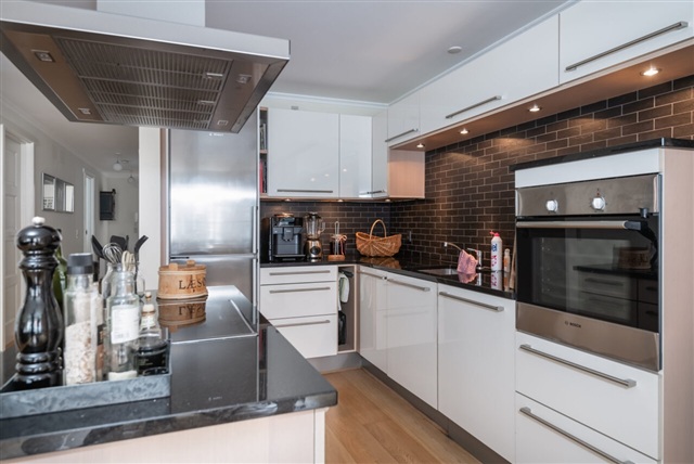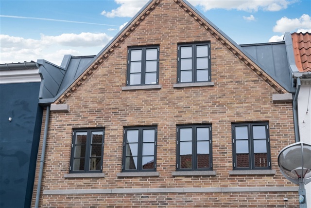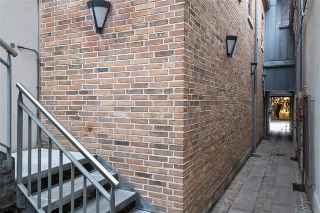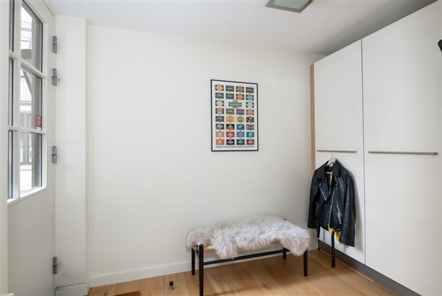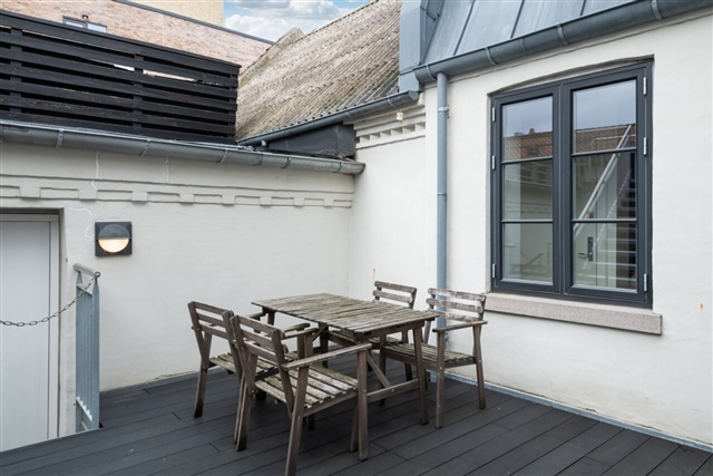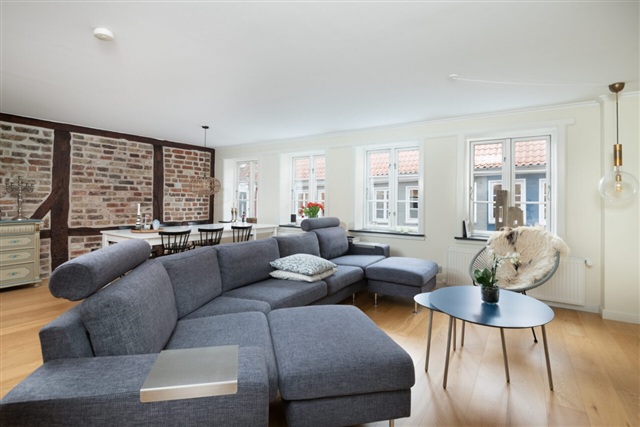 The apartment is accessed via a gallery walkway, which also features a terrace shared with the neighboring unit.Inside, the residence includes an entrance hall equipped with built-in closets designed to accommodate shoes and outerwear. From this hallway, all other rooms in the apartment are reachable through a central corridor. There are two bathrooms available-a full bathroom and a guest toilet-both fitted with a washing machine and dryer. Each of the two bedrooms offers a generous amount of space and includes fixed wardrobes. The spacious kitchen-living area overlooks Algade and showcases a beautifully preserved, rustic old timbered wall in the living room. The apartment comes fully equipped with all major household appliances. Wide plank flooring runs throughout, complemented by recently installed windows.