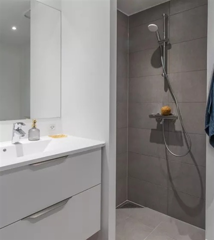 Access to the modern bathroom-fitted with a toilet, shower enclosure, washbasin, and storage-is available directly from the kitchen-living space. Upon entering, the apartment features a generous hallway equipped with a built-in wardrobe and sufficient room to add extra storage solutions, such as a shoe rack and coat hooks.