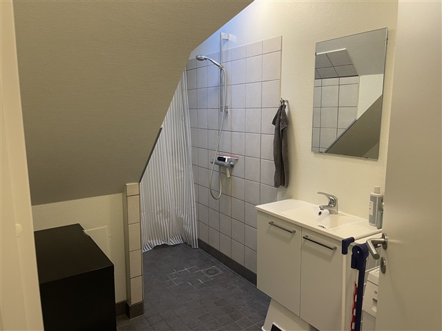 The layout includes an entrance hall that leads into a well-designed kitchen featuring a full range of appliances, ample cabinet storage, and a cozy dining area. The bathroom is thoughtfully arranged, offering a spacious shower area with white tiled walls, as well as a cabinet setup incorporating a recessed sink and a washing machine. The living room is bright and inviting, enhanced by large Velux windows that allow plenty of natural light to enter. The generously sized bedroom boasts exposed beams and built-in closets equipped with sliding doors.Parking spaces are available for rent. Residents have access to a pleasant courtyard. Pets are not permitted.